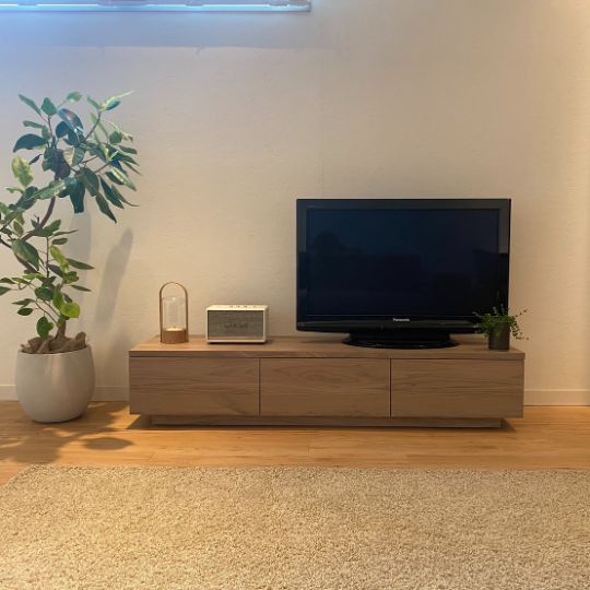 テレビを置いたバランスを考え、ロータイプのこの高さにすることで、テレビを直接置いていただいても、壁掛けにしても、圧迫感のないスッキリした印象となります。