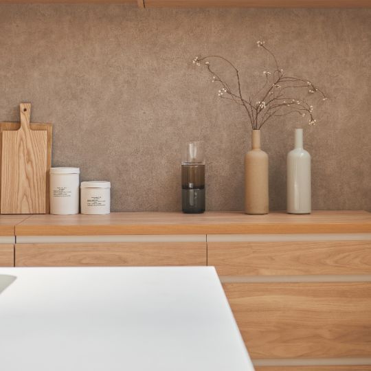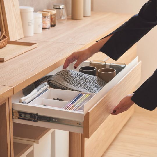 上質な素材だから使い勝手も良い - z/a.のキッチンシリーズは、ナチュラルな素材感とマットなホワイトパーツのアクセントが印象的なキッチンカウンターです。機能性にもこだわって設計し、よく触れる、使用するからこそ汚れや水濡れにも強く、汚れてもさっと拭いて頂ける使い勝がとても良いメラミン化粧板の最高傑作とメーカーが推奨する材を選びました。