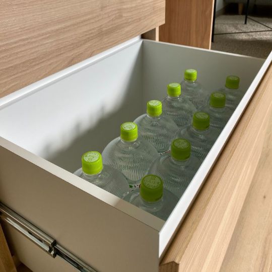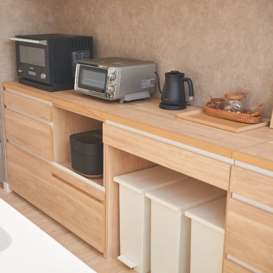 体に有害なホルムアルデビトを含むあらゆる有害物質を出さないバーミキュライトという天然の粘土鉱物です。家電製品がたくさん置けて、収納もたくさん入り機能性にも優れ、嬉しいが兼ね備わったタイプのカウンターです。