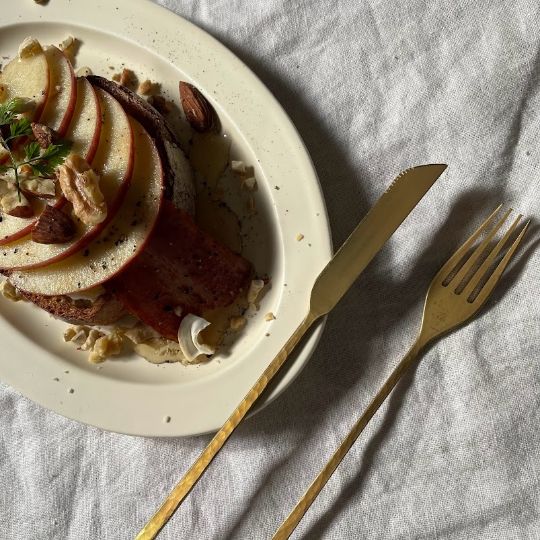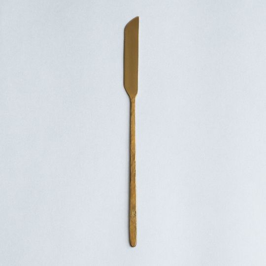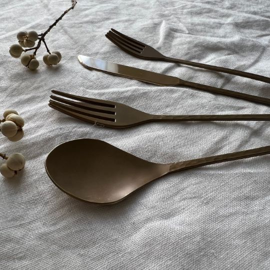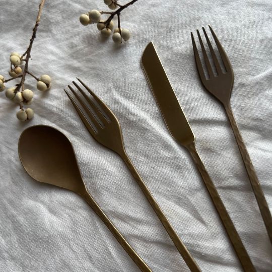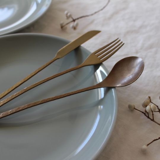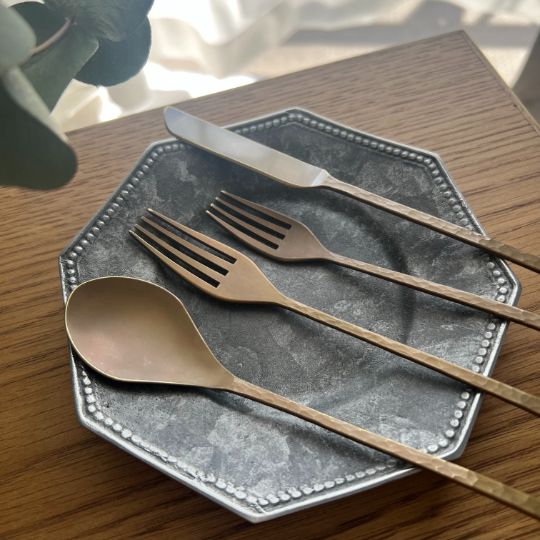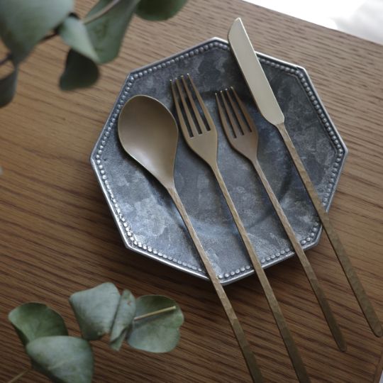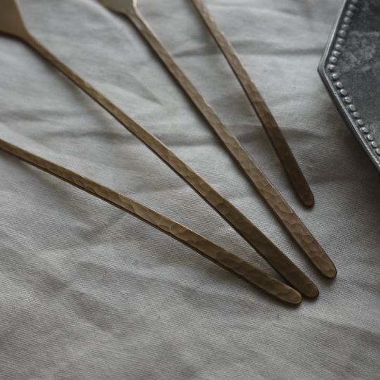 樫原ヒロさんのカトラリーは独特の表面加工で、まるで使い古したようなアンティーク、クラシックな風合いがあります。使うたびに少しずつ見えてくる真鍮本来の柔らかな金色とのコントラストが、テーブルにシャビーシックな印象を添えてくれます。